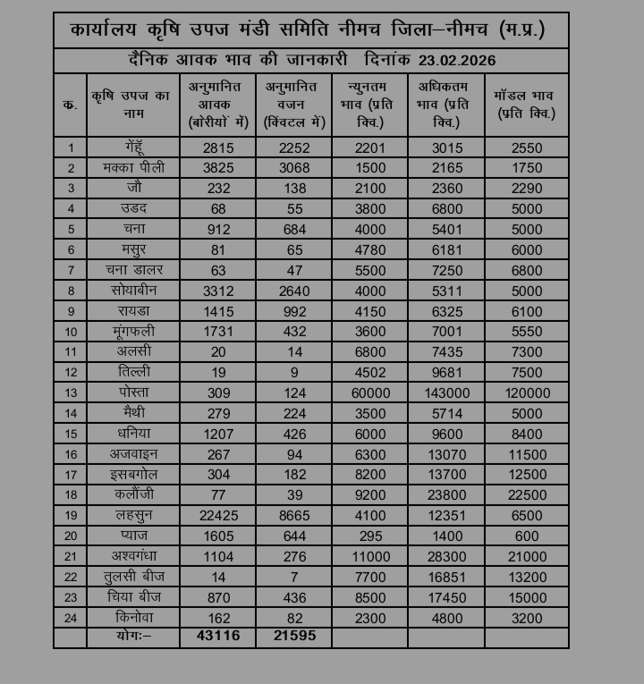 नीमच मंडी सोयाबीन के साथ गेहूं के भाव में जोरदार तेजी लहसुन के भाव में भी सुधार आज के आर्टिकल में बात करेंगे नीमच कृषि उपज मंडी की नीमच मंडी में फसलों के भाव क्या कुछ रहे हैं विस्तार से जान लेते हैं आज टोटल आवक तरणी हजार 43116 रही औषधीय फसलों के भाव क्या कुछ रहे हैं इसकी जानकारी भी हम इस आर्टिकल में जानेंगे।