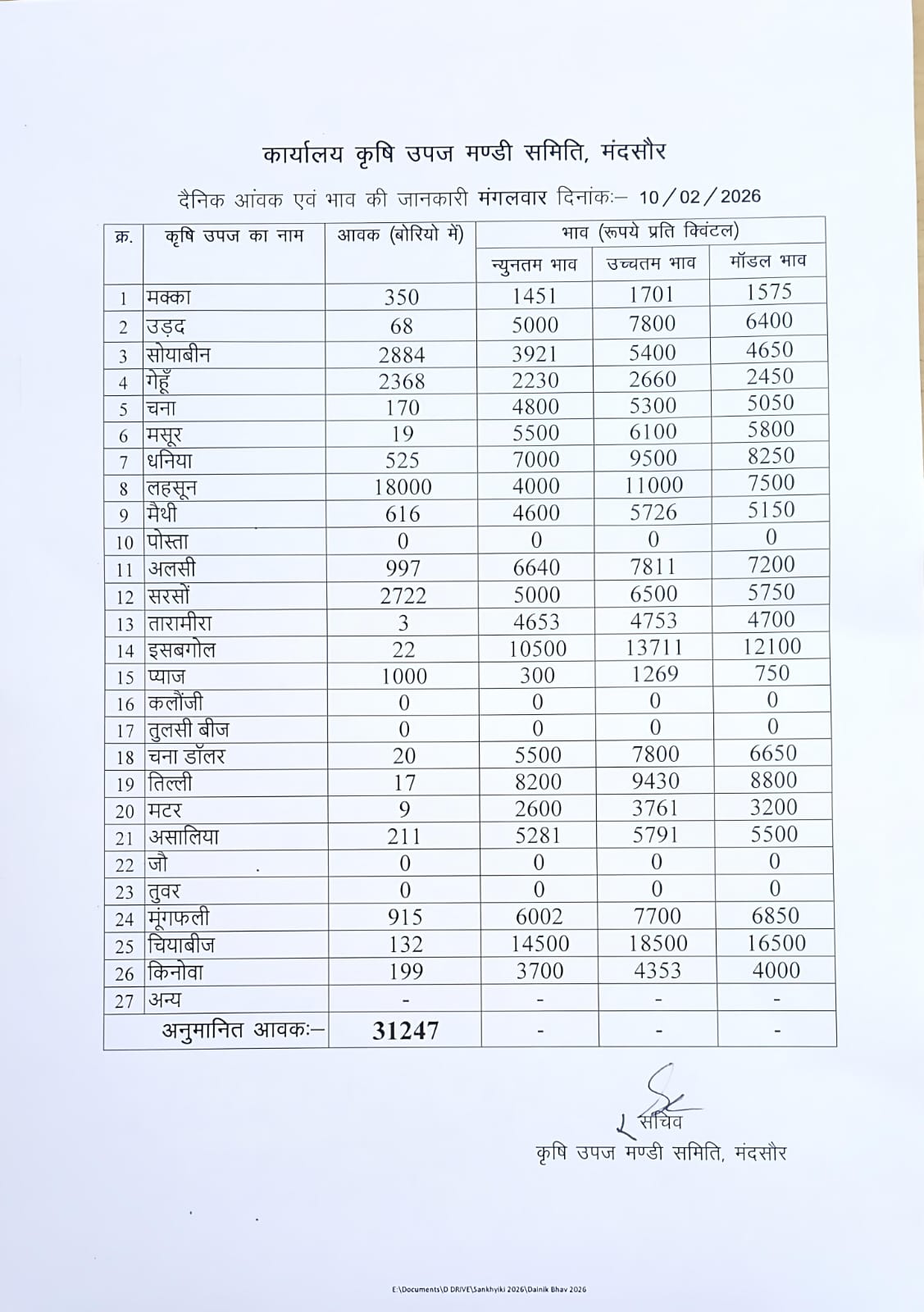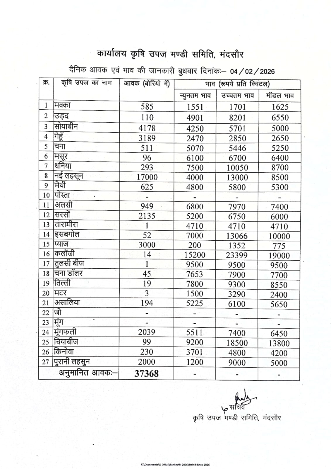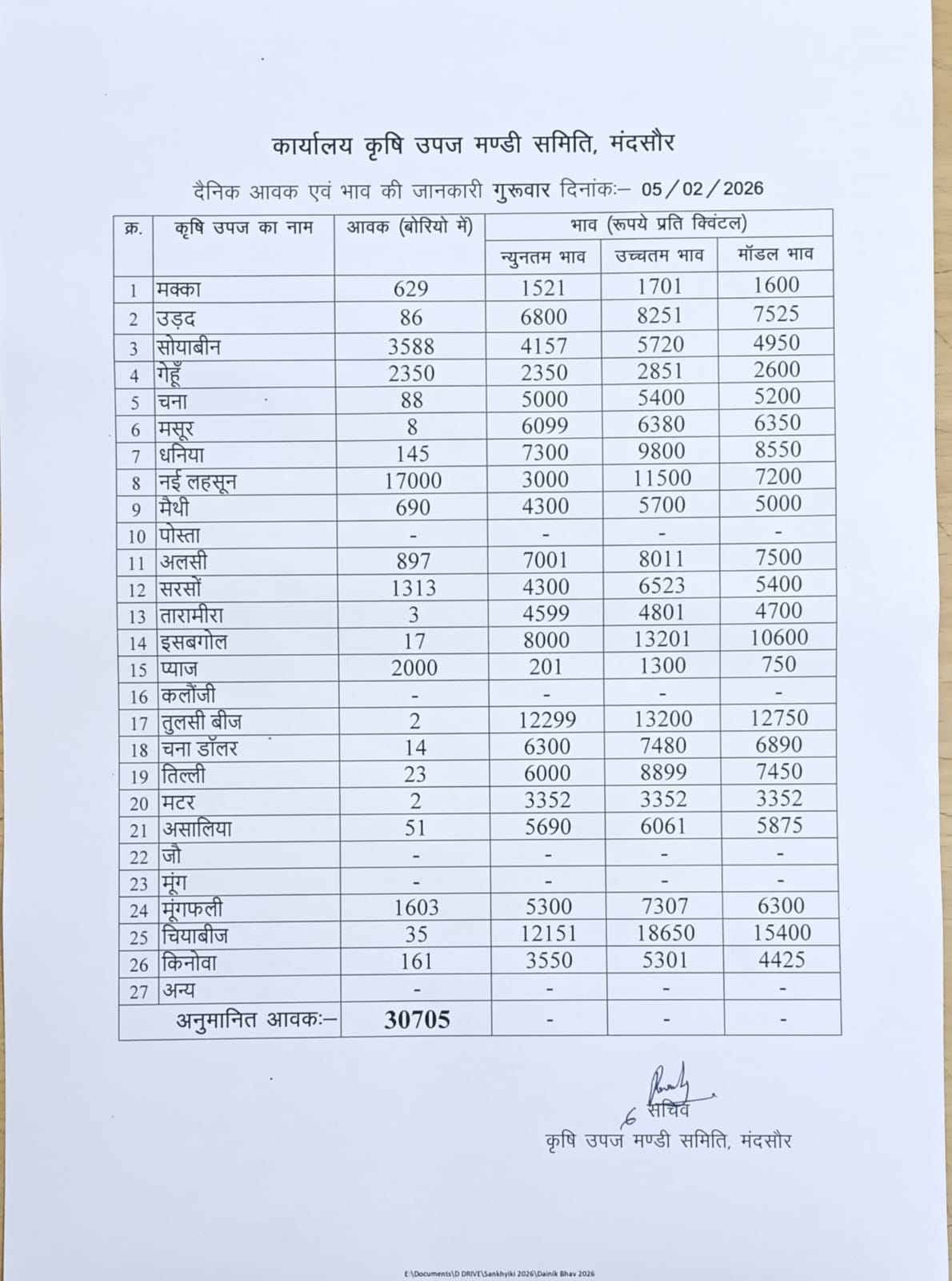 मंदसौर मंडी सभी फसलों के भाव एक नजर में 5 फरवरी 2026