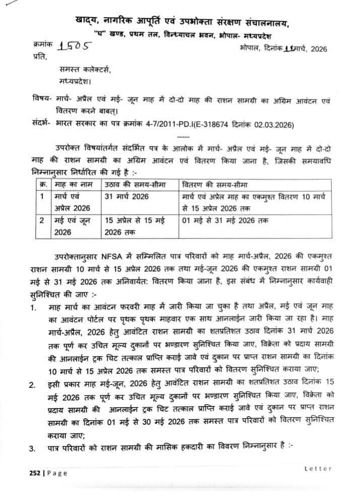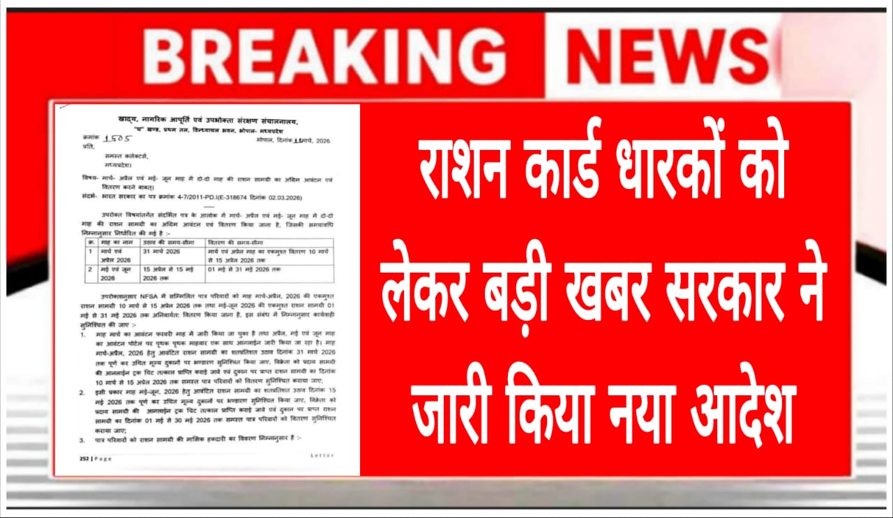 राशन कार्ड को लेकर उपरोक्त अनुसार एनएफएसए में सम्मिलित पत्र परिवार को माह मार्च अप्रैल 2026 की एकमात्र राशन सामग्री 10 मार्च से 15 अप्रैल 2026 तक तथा मैं जून 2026 की एक मोस्ट राहत सामग्री 1 में से 13 में 2026 तक अनिवार्य वितरण किया जाना है कि संबंध में निम्न अनुसार कार्रवाई सुनिश्चित की जाए.